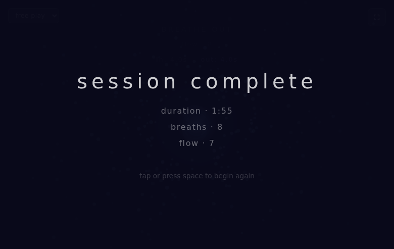 As you settle into a consistent breathing rhythm, the experience evolves. Geometric patterns emerge, particles begin to dance, and the ambient drone soundtrack (generated live via Web Audio) builds in subtle layers. The longer you maintain your rhythm, the more the world reveals itself. It's a quiet reward system that encourages presence without pressure.