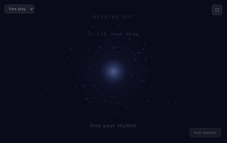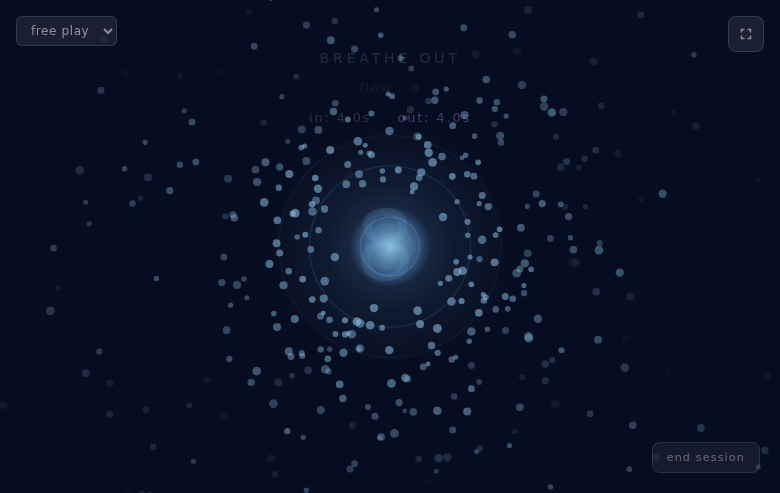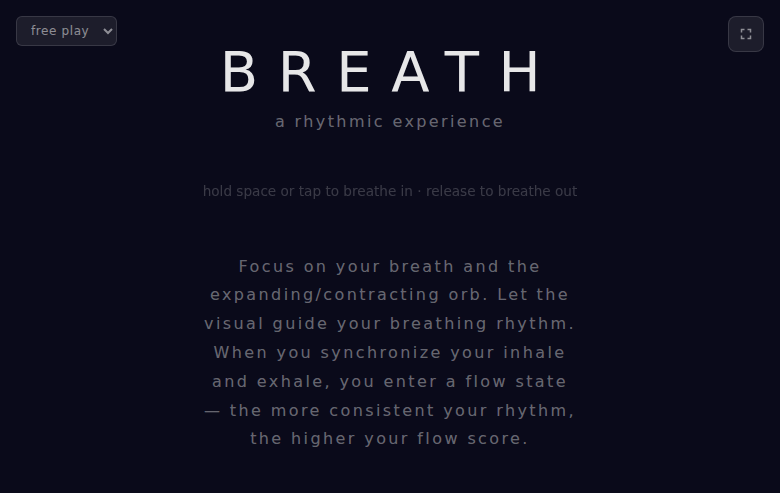The premise is simple: hold spacebar (or touch the screen) to breathe in, and watch the universe expand and brighten around you. Release to breathe out, and feel the world gently contract and soften. There's no score, no timer, no winning or losing — just you and the visual landscape, moving together.